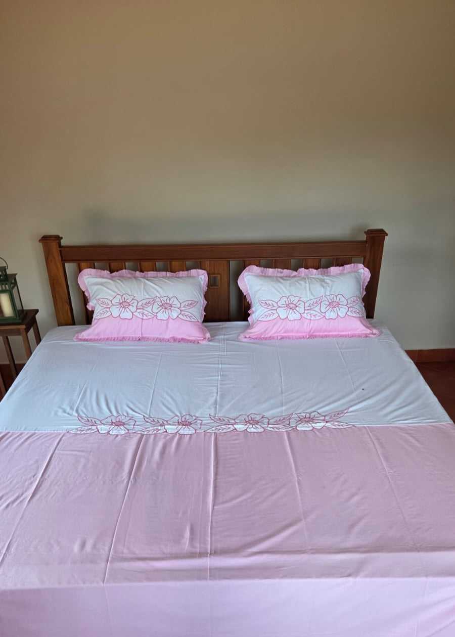 This applique work embroidery sheet set, accompanied by two pillow covers, showcases meticulous craftsmanship and refined design. The detailed applique embroidery adds a sophisticated texture that enhances the visual appeal and tactile experience. Perfectly matched pillow covers complete the ensemble, offering a harmonious and elegant addition to your bedroom décor. Designed for those who value quality and artistry in home textiles.