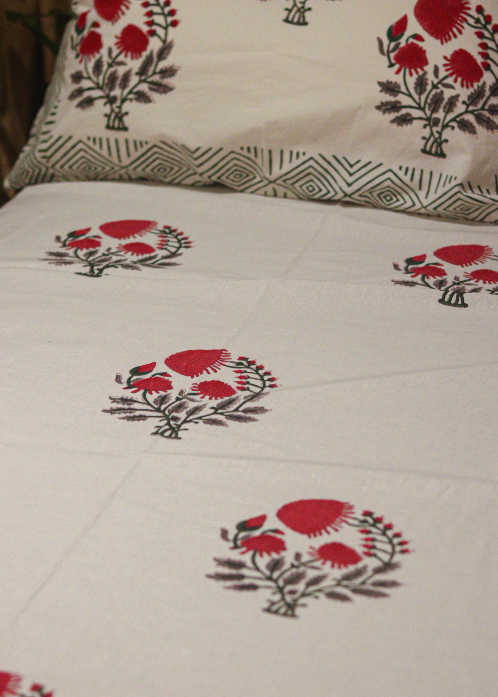Enhance your bedroom with our Block Printed Sheets and 2 pillow covers. Experience the luxury of high-quality, beautifully handcrafted sheets while adding a touch of elegance to your bedding. The intricate block printing technique creates a unique and timeless design, making your bed a focal point. Transform your room into a sophisticated oasis with this set.